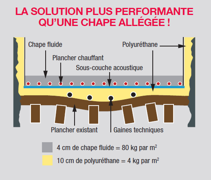 Cette solution à la double fonction : isoler et supprimer une chape de ravoirage supplémentaire.